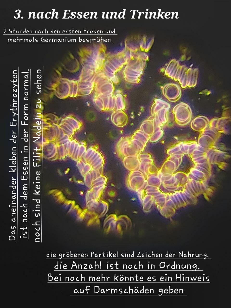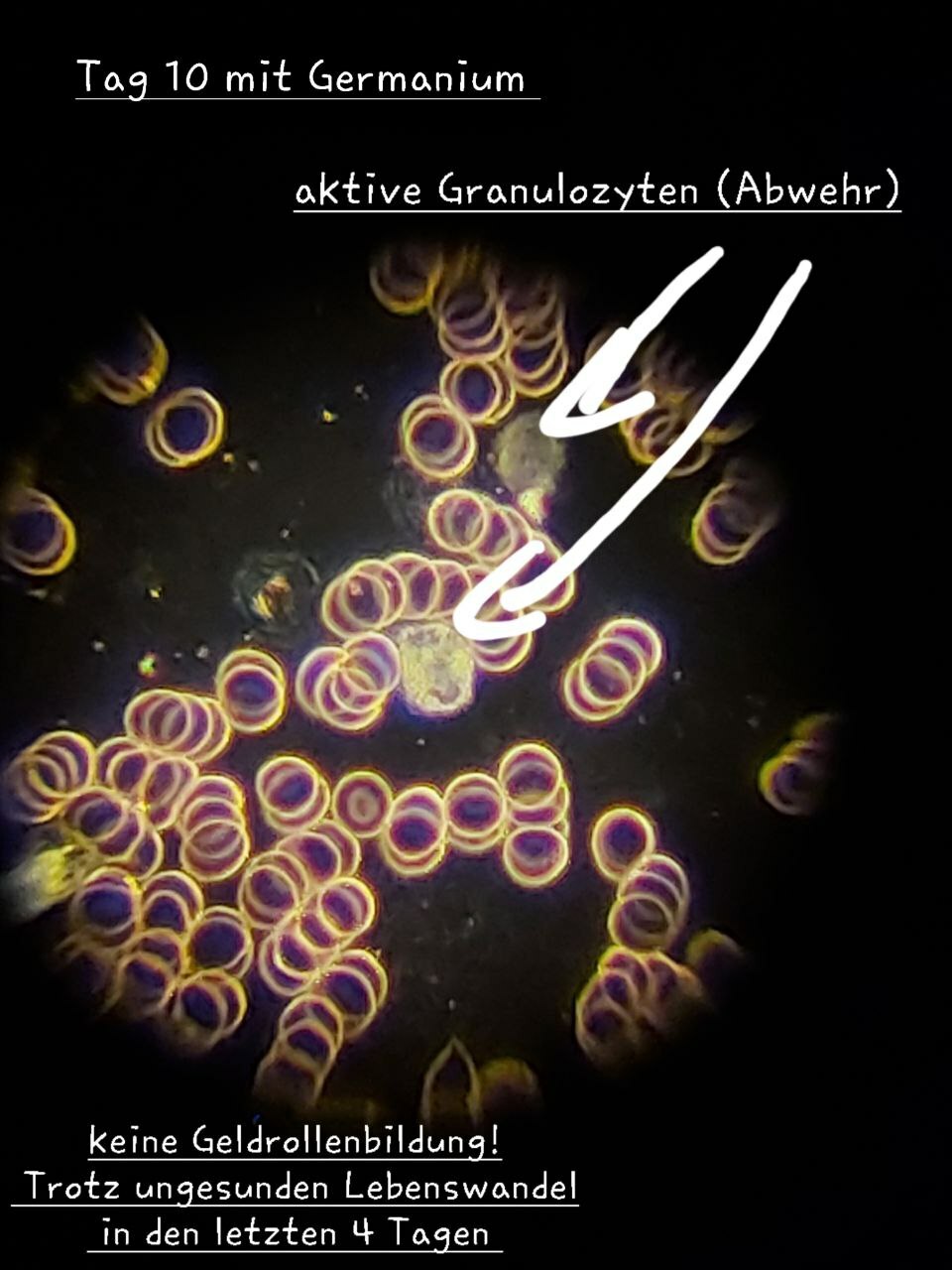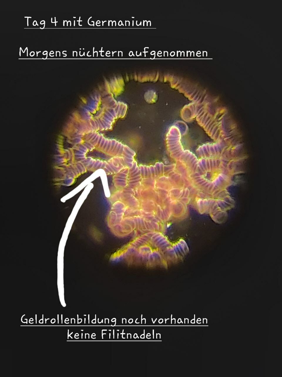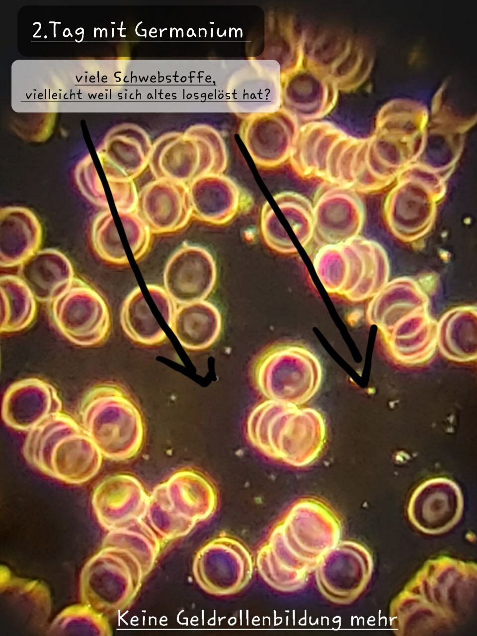 Erythrozyten sind für den Sauerstofftransport verantwortlich. Unter bestimmten Bedingungen kann es zur Geldrollenbildung kommen, bei der Erythrozyten in Ketten angeordnet sind, was auf Entzündungen hinweisen kann. Die Aufnahmen deuten darauf hin, dass kolloidales Germanium diese Geldrollenbildung auflöst und somit die Gesundheit der Blutzellen verbessert.