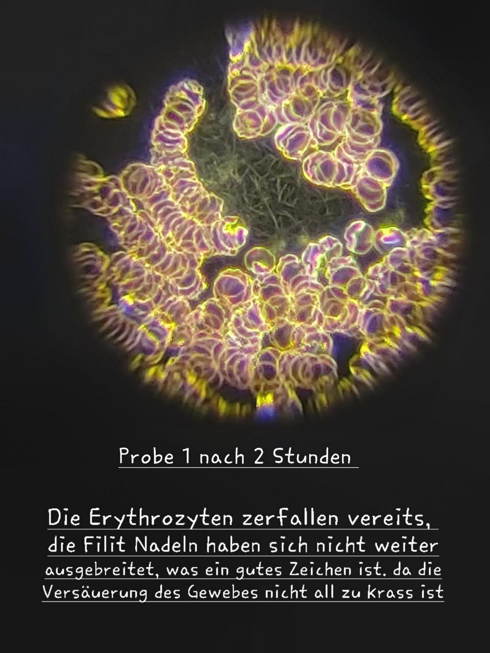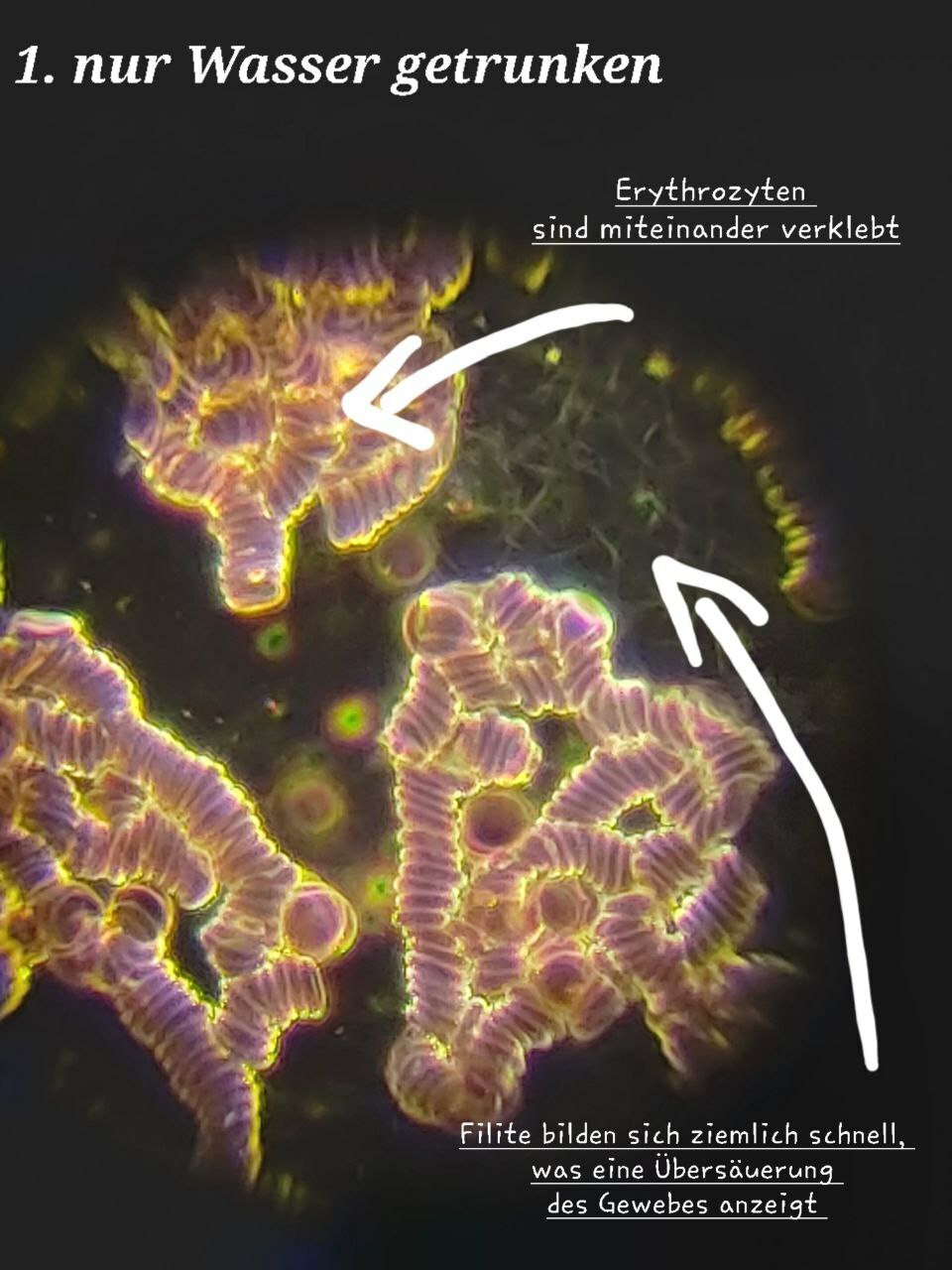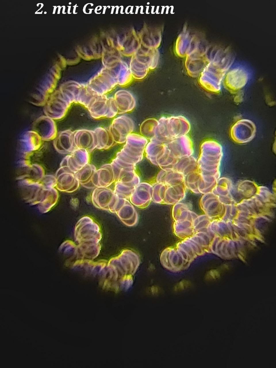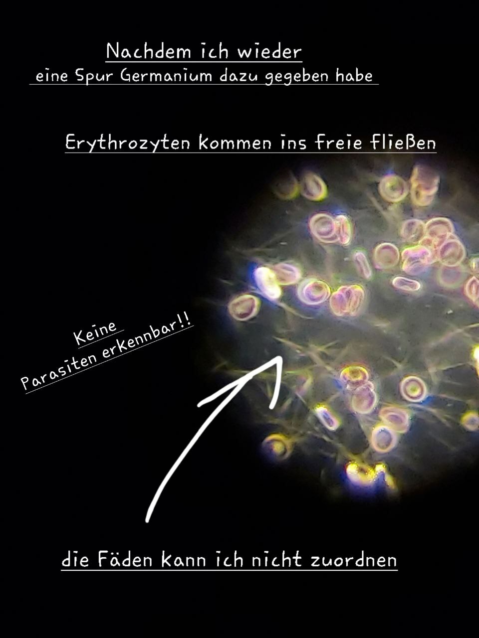 Erythrozyten sind für den Sauerstofftransport verantwortlich. Unter bestimmten Bedingungen kann es zur Geldrollenbildung kommen, bei der Erythrozyten in Ketten angeordnet sind, was auf Entzündungen hinweisen kann. Die Aufnahmen deuten darauf hin, dass kolloidales Germanium diese Geldrollenbildung auflöst und somit die Gesundheit der Blutzellen verbessert.