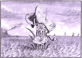 Ich sehe eine große kristalline Spitze, etwa in der Form einer Pyramide, aber größer als die Erde. Sie berührt die Erde an einem Punkt, blau durchsichtig, ein wenig wie aus Eis. Der Punkt, wo sie die Erde berührt, ist von einem weißen Kreis gesäumt, der glatt wird, wie ein Sportplatz für Wurf- und Schleuderübungen.